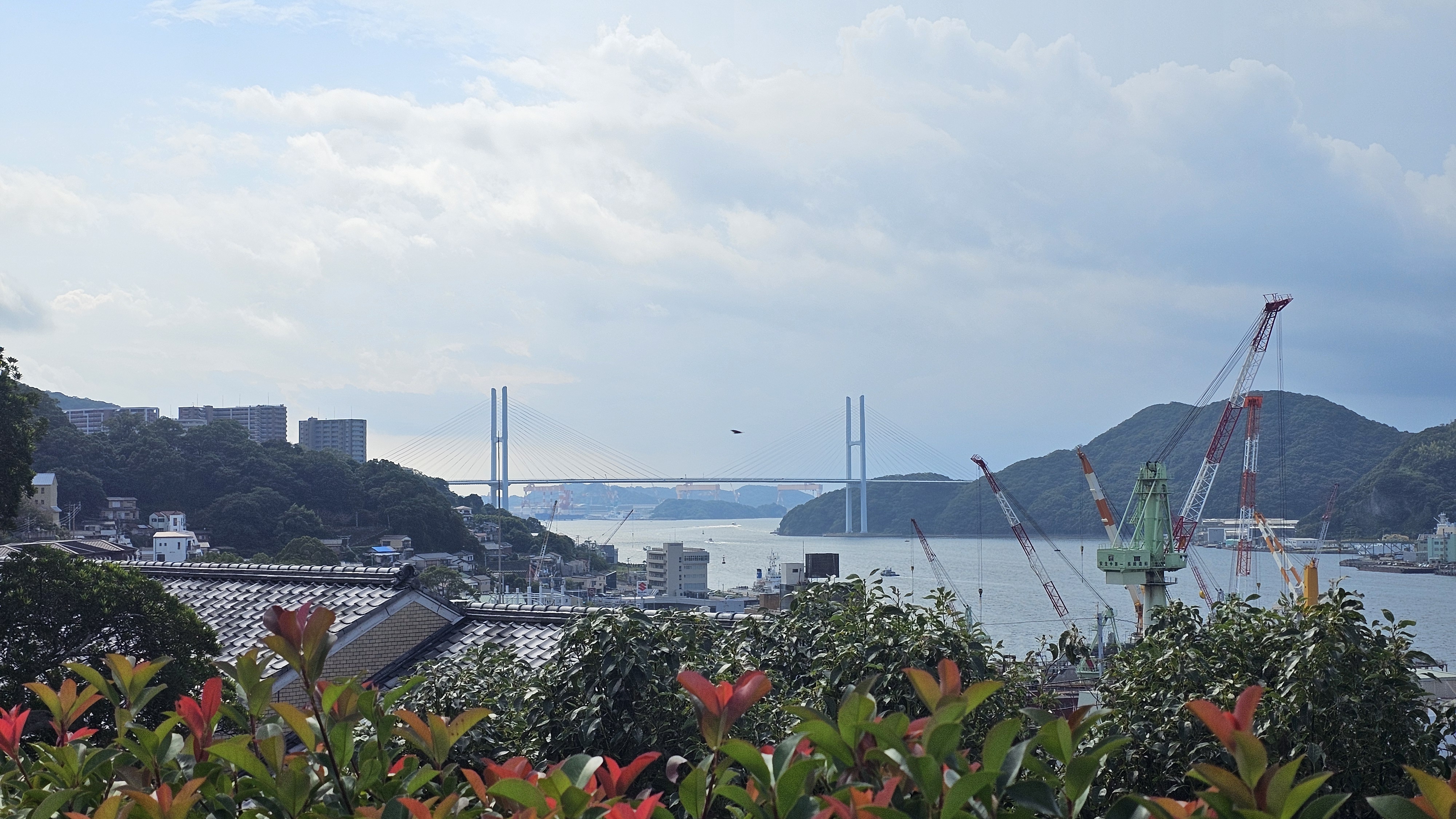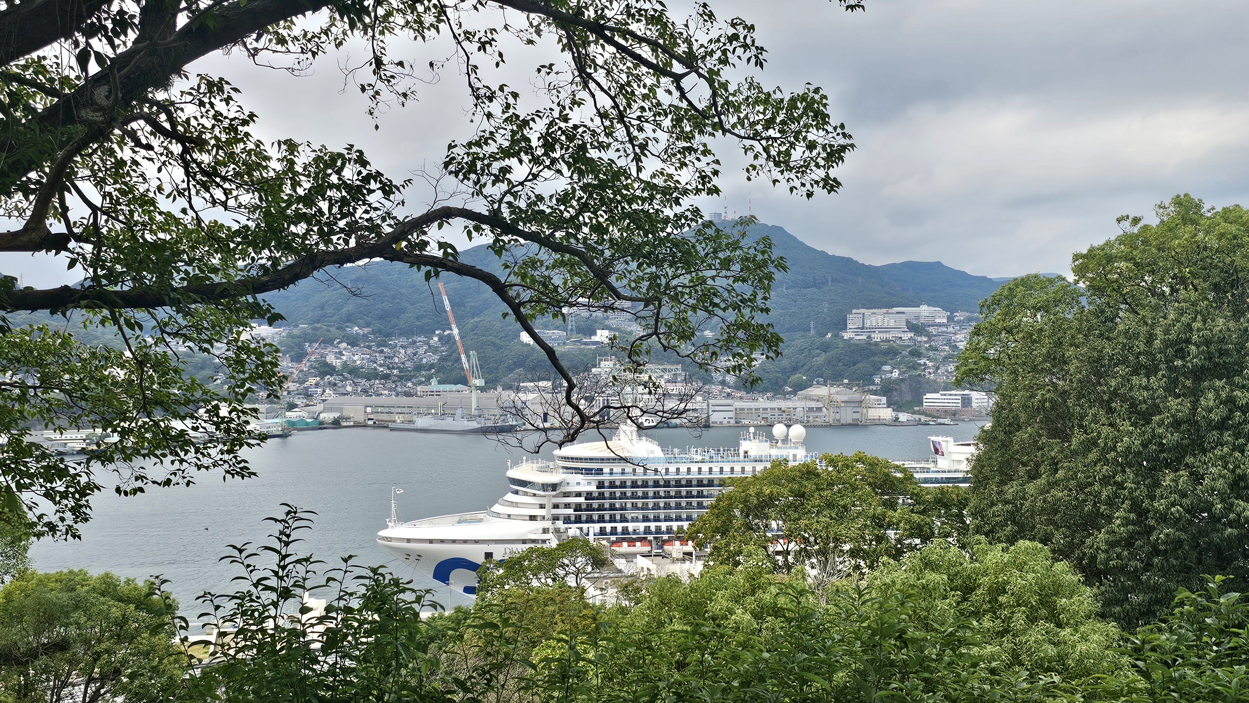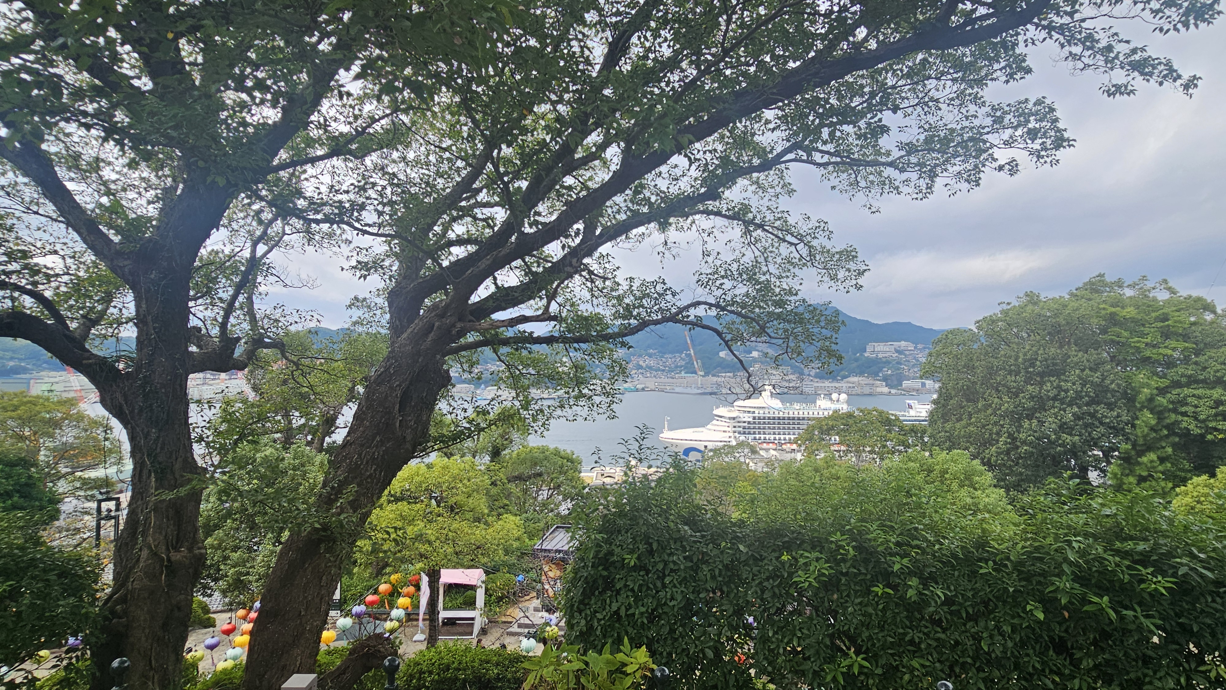 앞에 보이는 바다에 대형 크루즈 한 척이 정박해 있다.크기가 커서 나가사키항을 거의 차지한다.