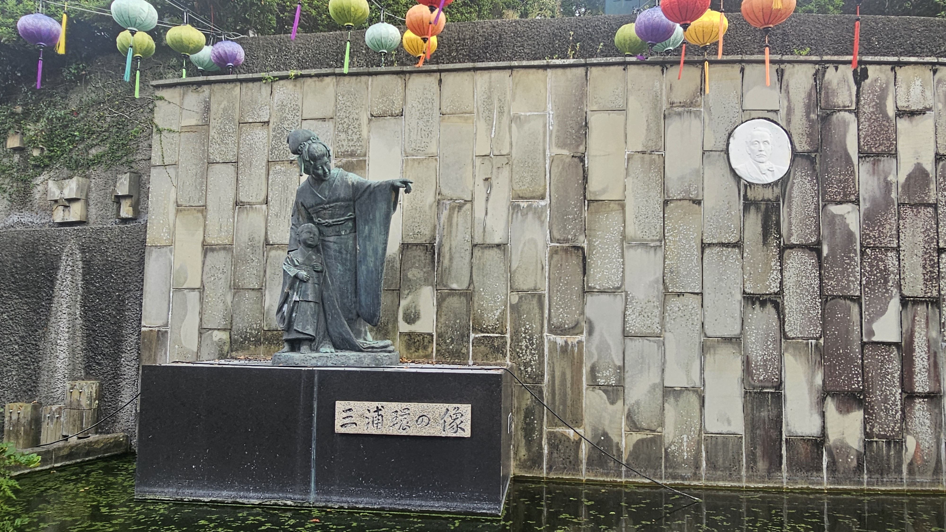 세살바기 아들과 함께 남편이 돌아오는 나가사키항을 가르키는 미우라 타카미 동상