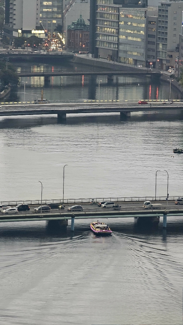 왼쪽 하카타 강이 도심에서 이어져 있는 것이 보인다.