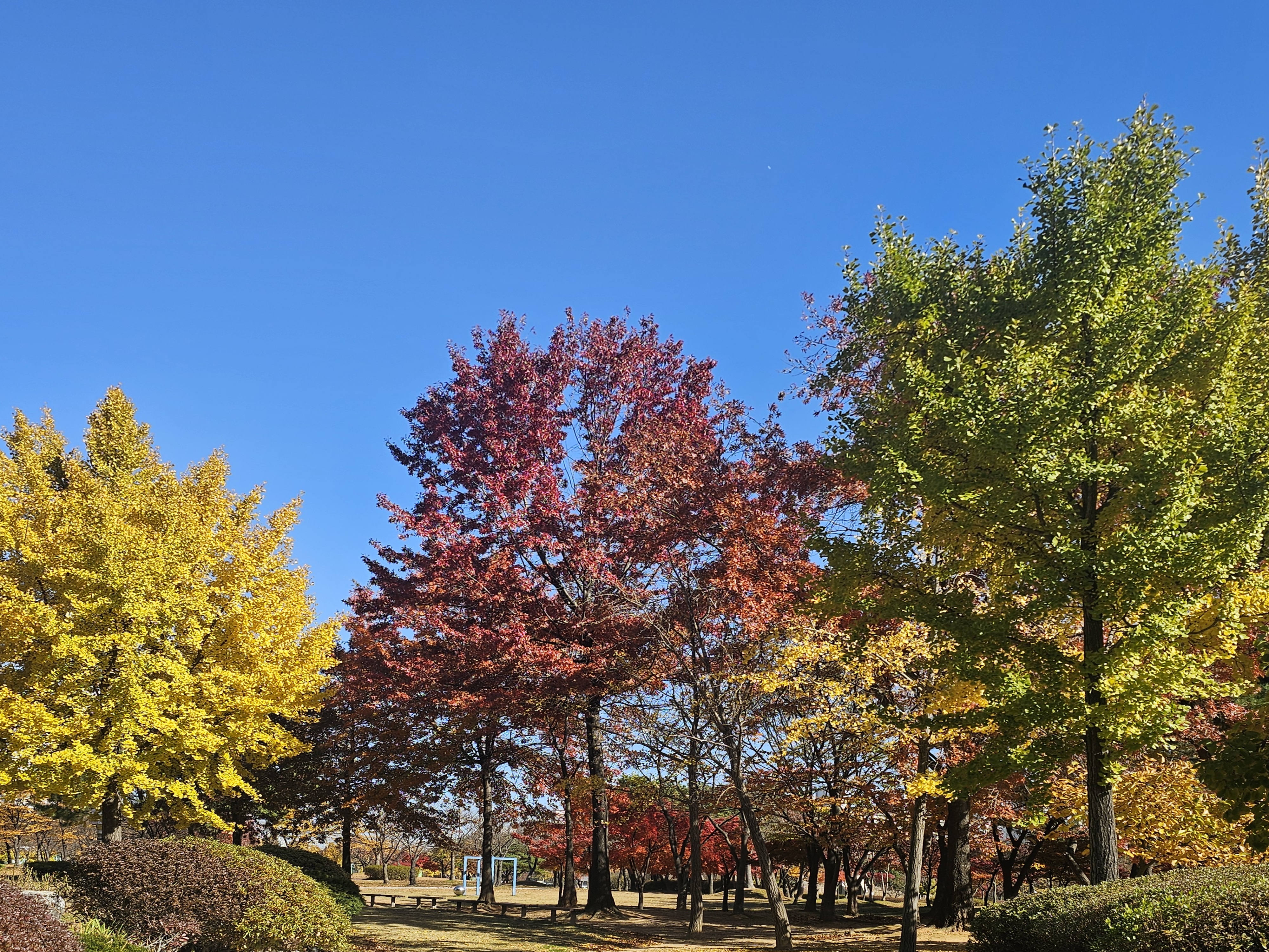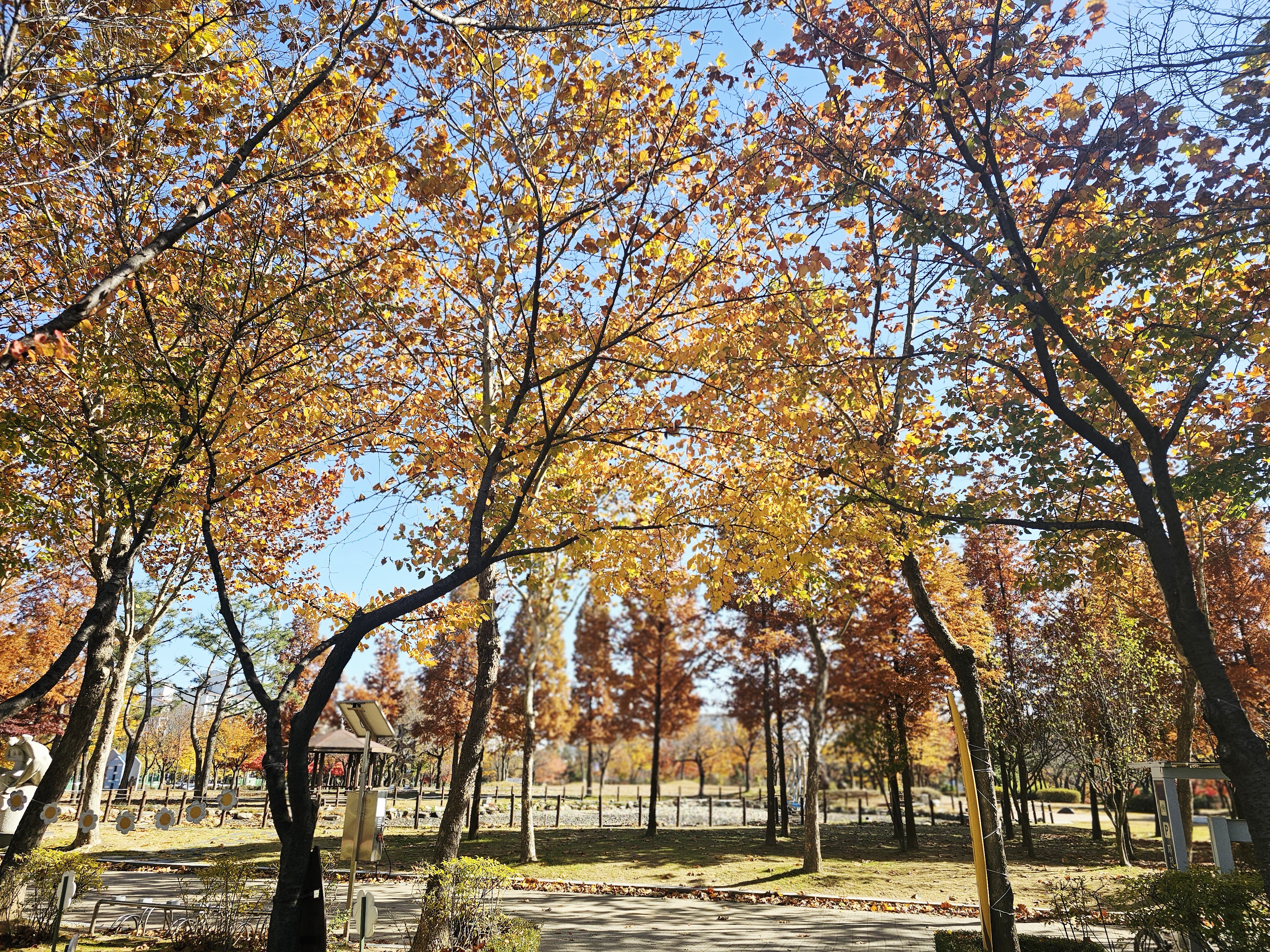 차 타고 지나가다 보니 길거리 가로수 단풍이 노랗게 빨갛게 색감이 곱고 무척이나 아름다운 만추이다.