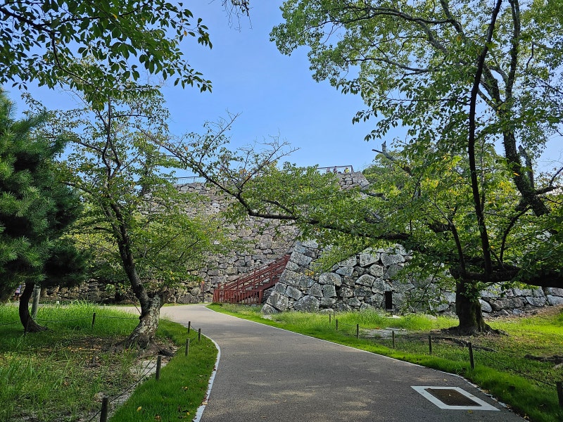 부지런히 오호리공원 가느냐고 여길 스치고 지나갔는데, 왼쪽에 성벽이 일부가 살짝 보인다