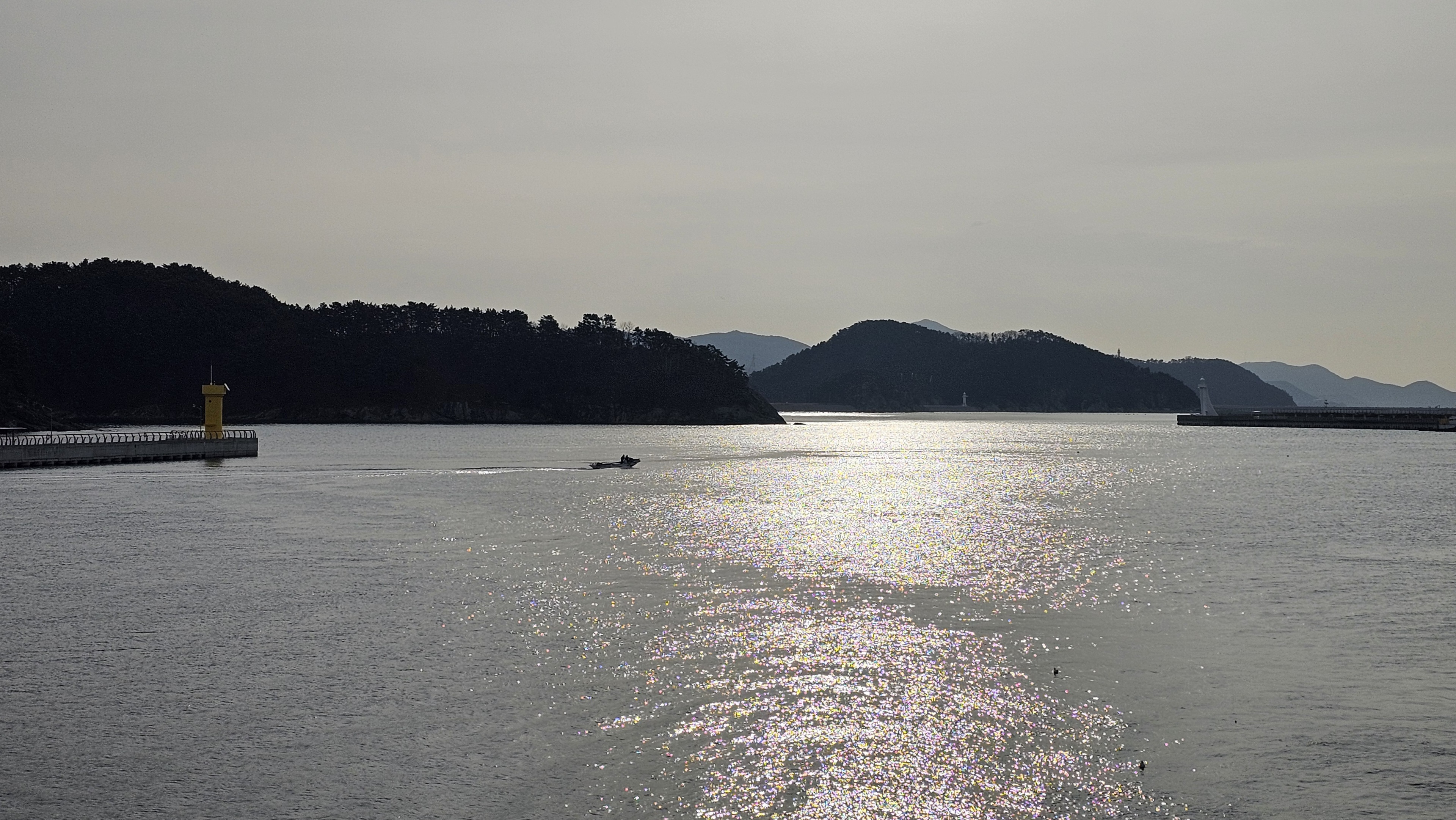 은빛윤슬이 눈부시게 반짝이는 바닷가에 배 한 척이 출항한다