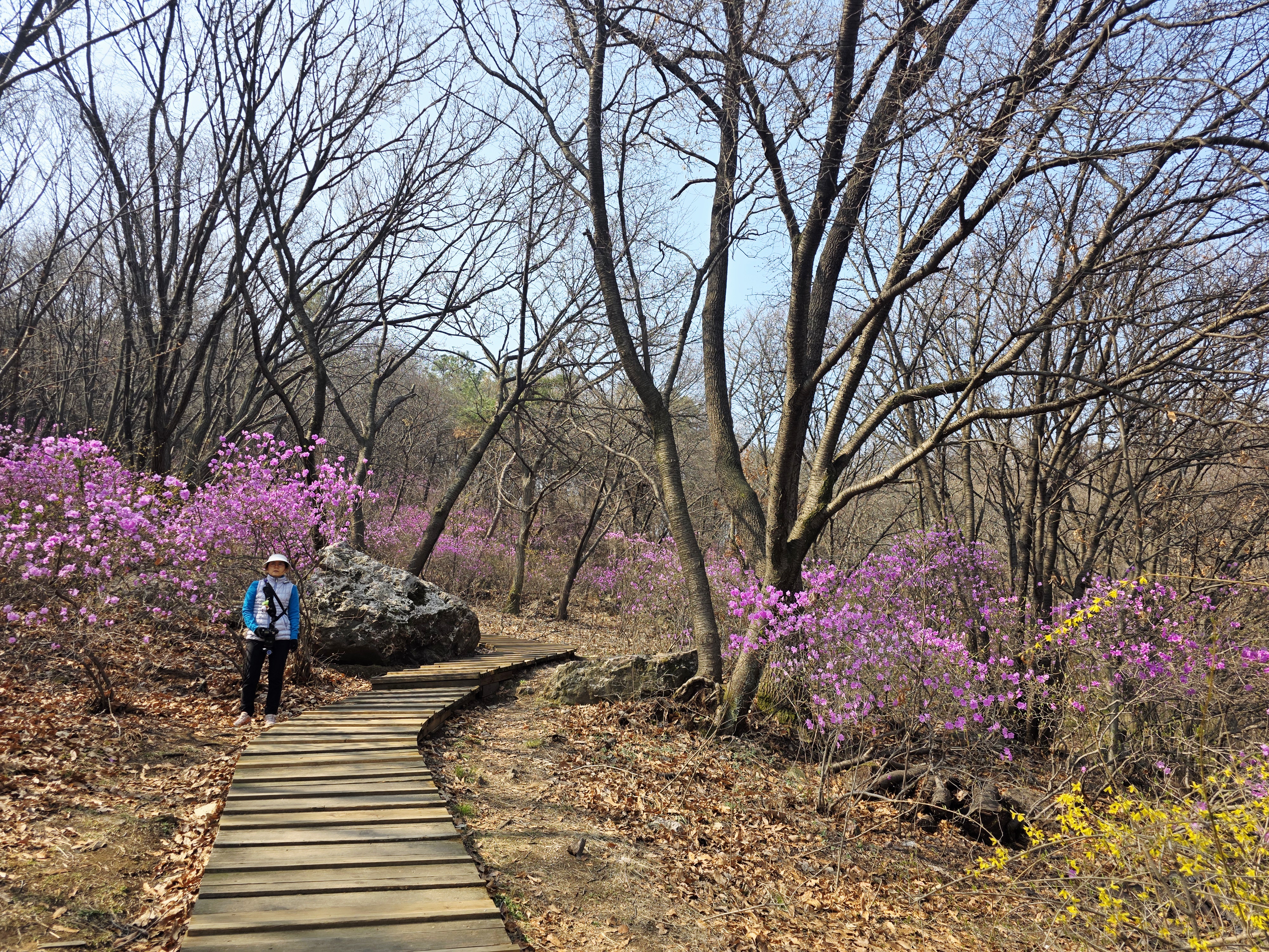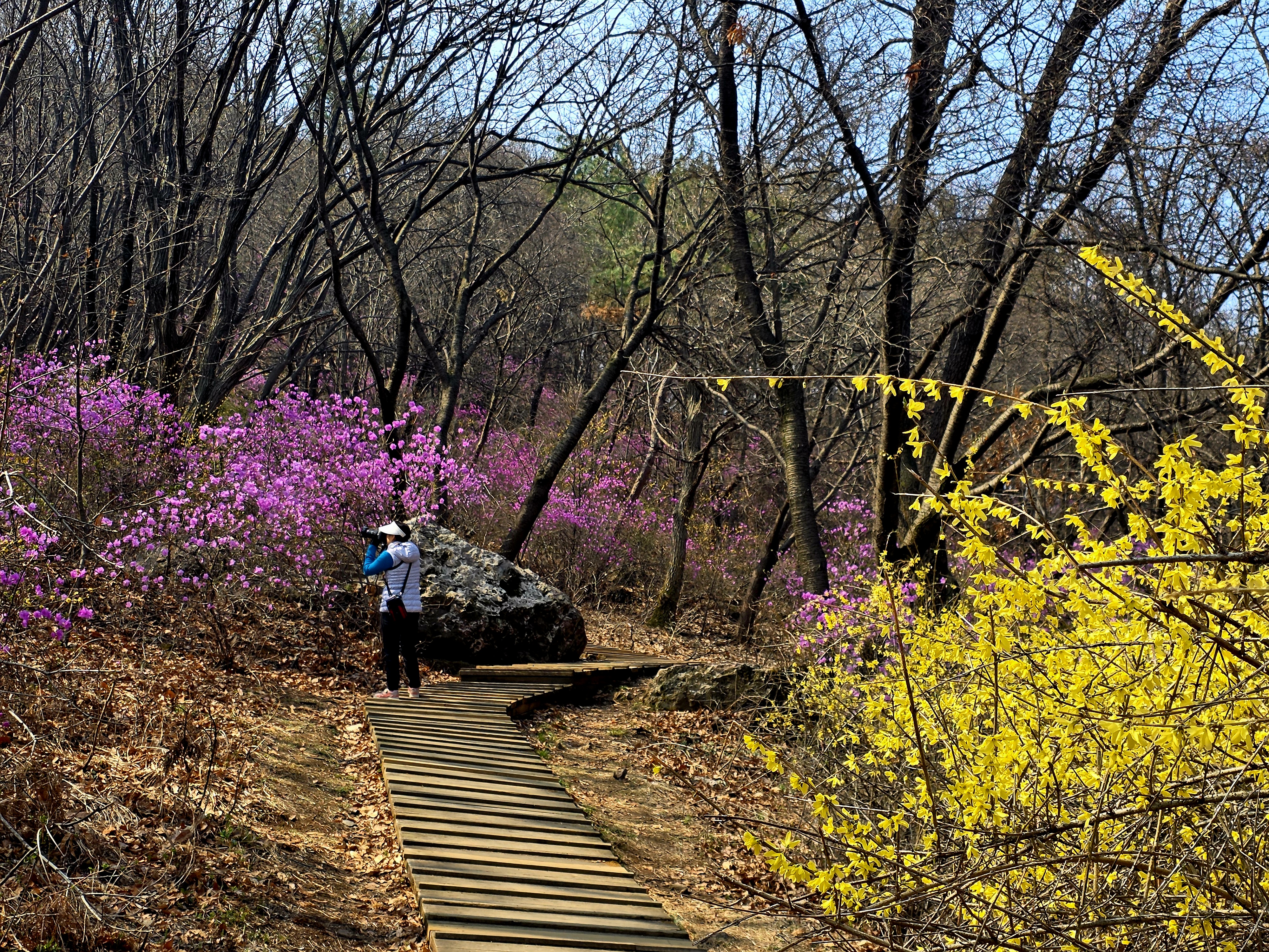 어느 카메라를 든 여인이 제 앞에서 진달래 풍경을 담습니다.